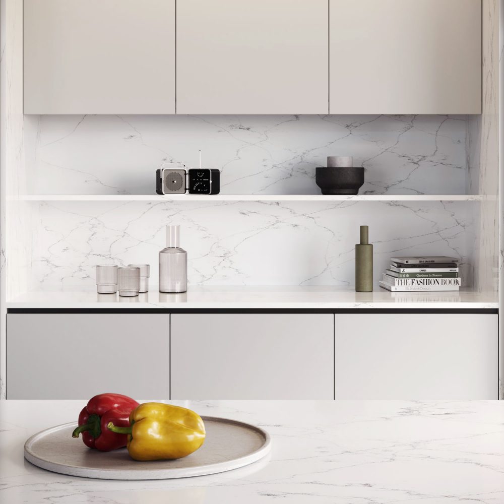 Bianco Giulia is part of the Musa Collection. Its vein tone with darkness and intensity gives a very natural effect, adding unique personality to the rooms it envelops. This color is available in SATIN, LUX, LITHOS and VELLUTO finishes. It can also be BOOK MATCHED.