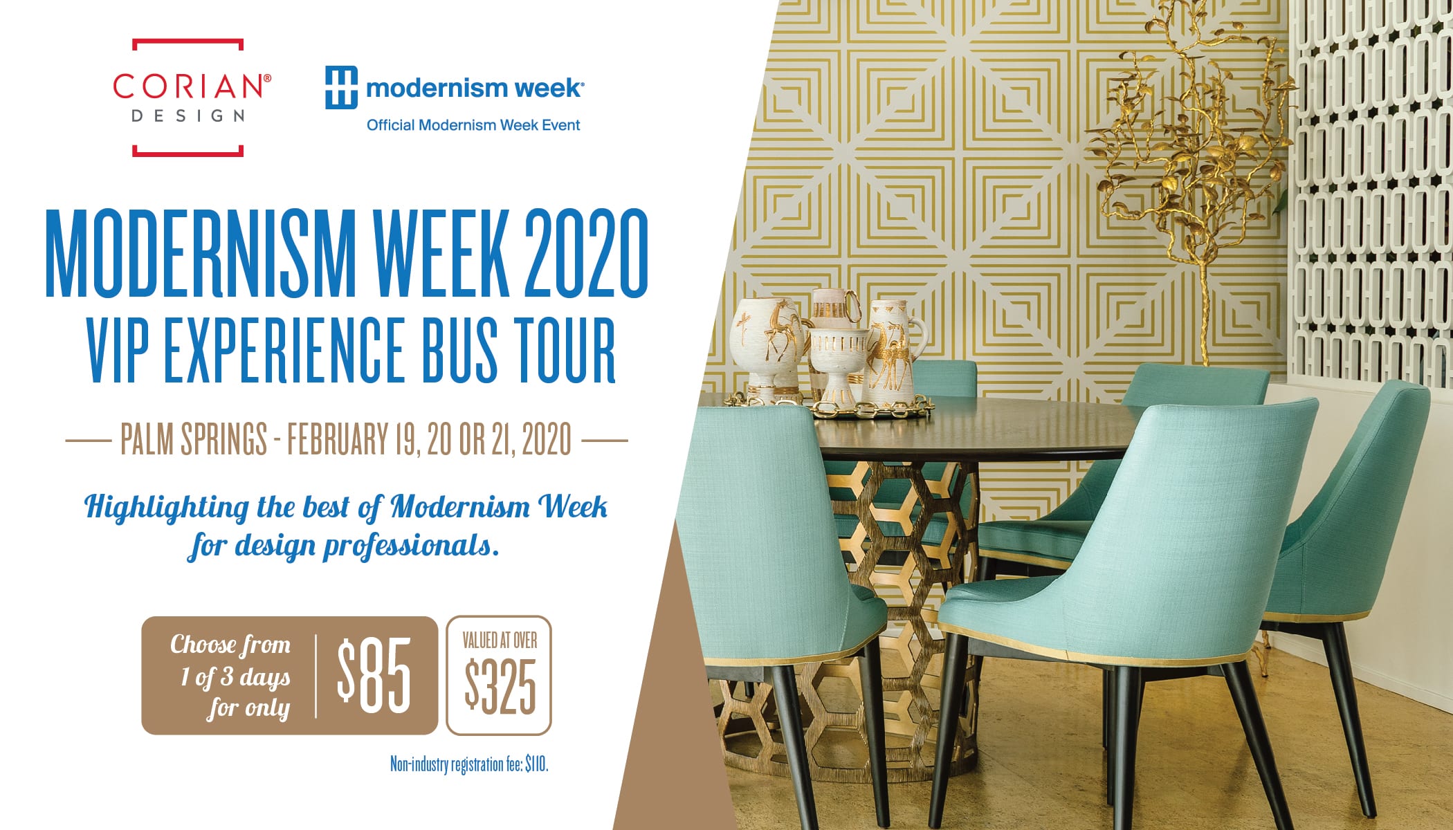 Corian® Design, Modernism Week and our sponsors are pleased to bring back the sought-after VIP Bus Tour Experience during Modernism Week 2020 for 3 days only! February 19th, 20th, and 21st