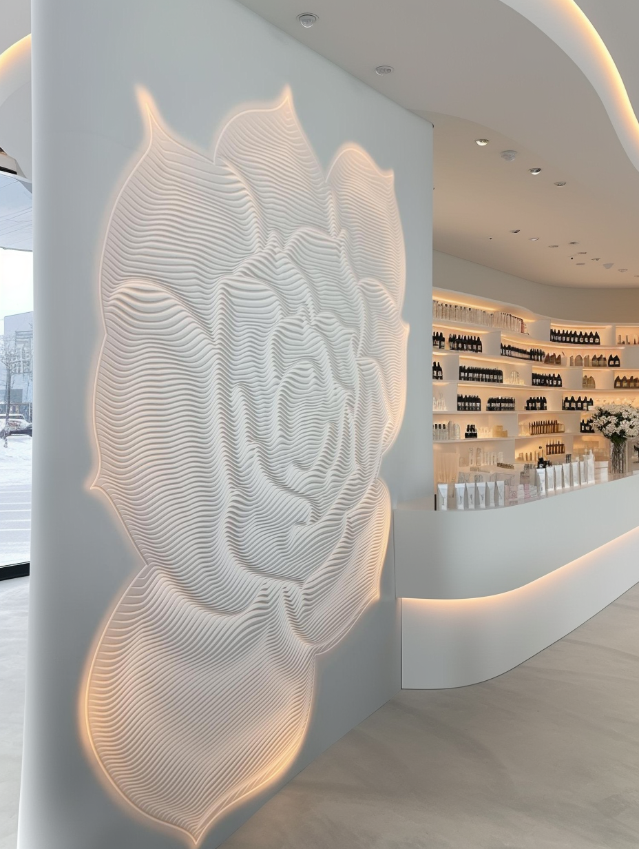 Retail and corporate spaces often use architecture as a vehicle for brand expression. M|R Walls allows designers to translate brand language into physical form through carved logos, illuminated surfaces, and integrated signage.