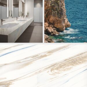 Evoking sky and sea, Vasto Laguna pairs blue and warm grey veining with a crisp white base to create a sense of open, natural calm inspired by coastal landscapes.
