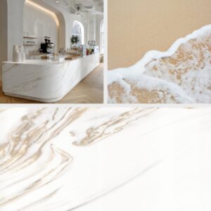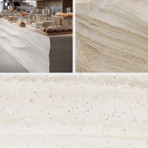 Across this collection, each surface is inspired by natural environments. Travertine Firenze and Travertine Roma reflect the quiet rhythm of geological movement, while Vasto Greige and Vasto Laguna evoke expansive terrain and shoreline flow. City Roast and Artista Mocha are rooted in rich earth tones and organic materials, bringing warmth and depth. Artista Drift softens into a more atmospheric expression, where light, air, and movement feel suspended and subtle. Coastal Haze and Harbor Veil capture the quiet shift of coastal atmosphere, where mist, moisture, and light dissolve into one another.