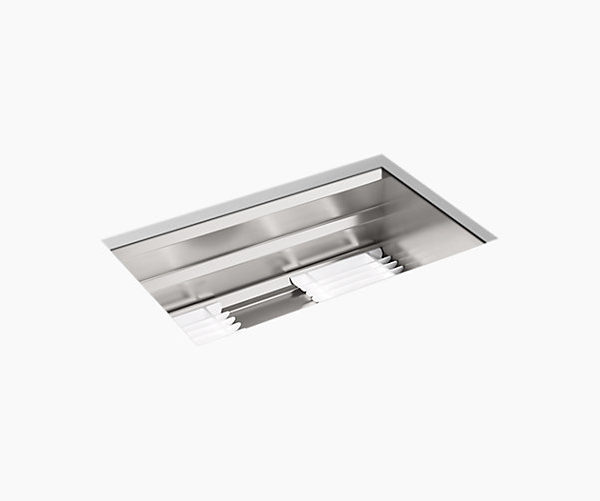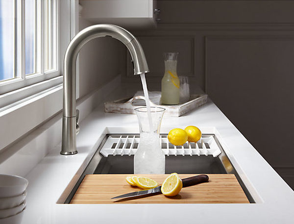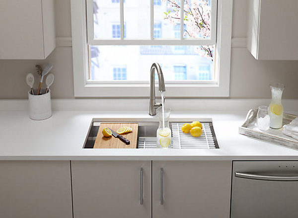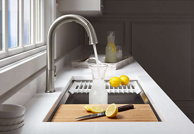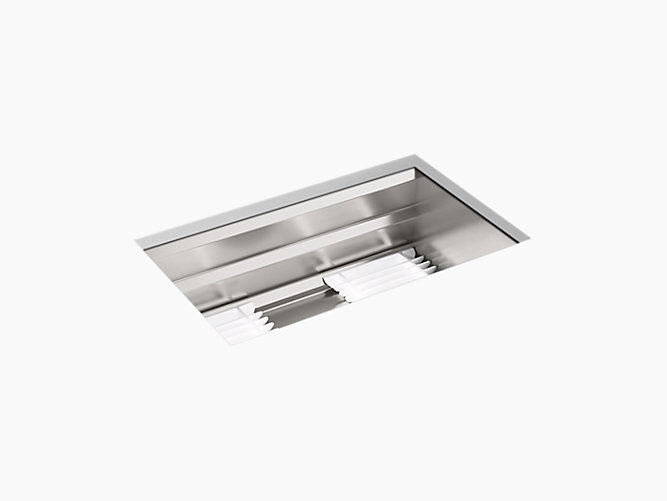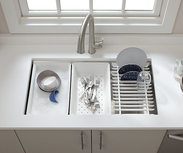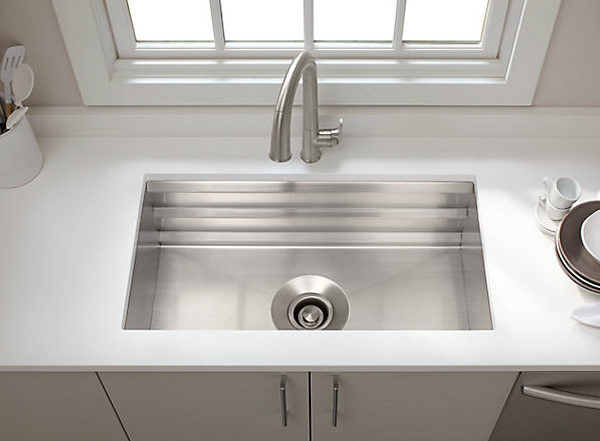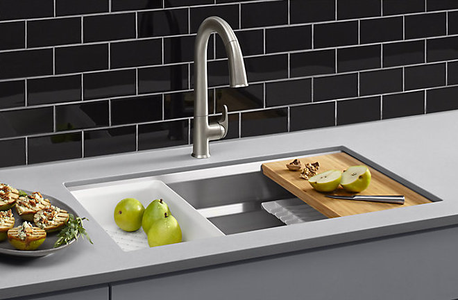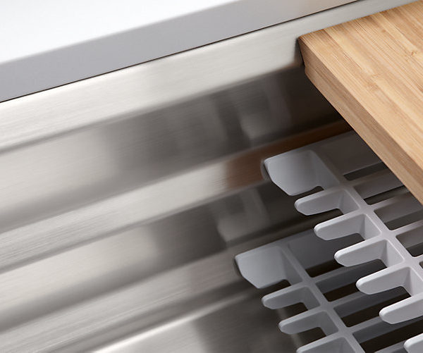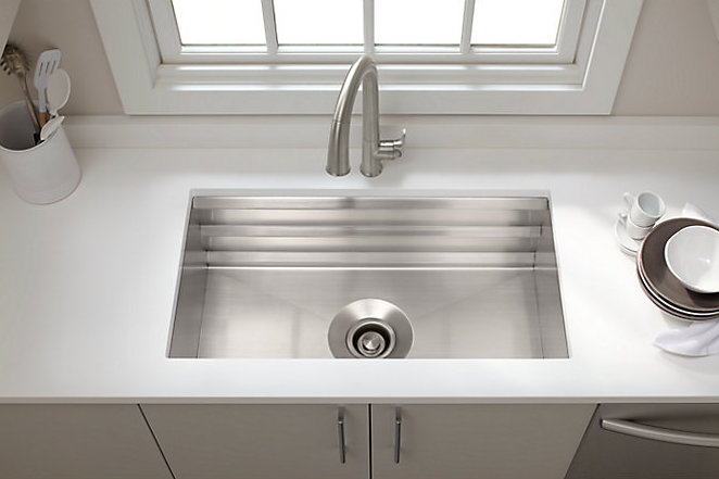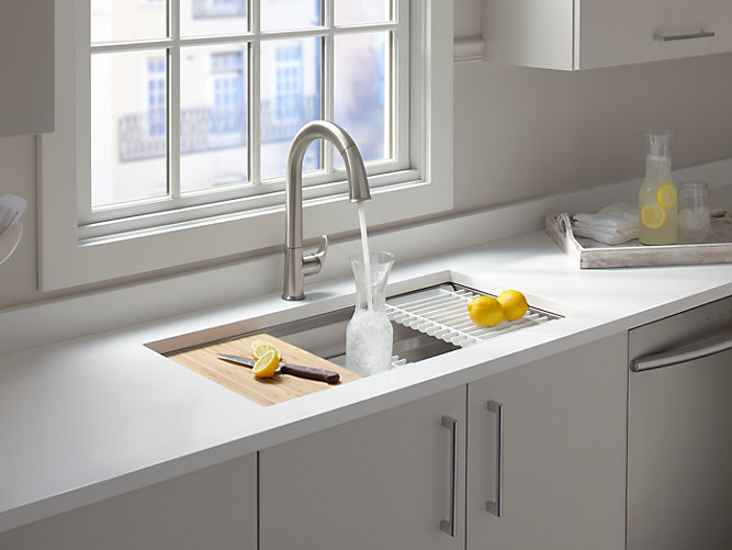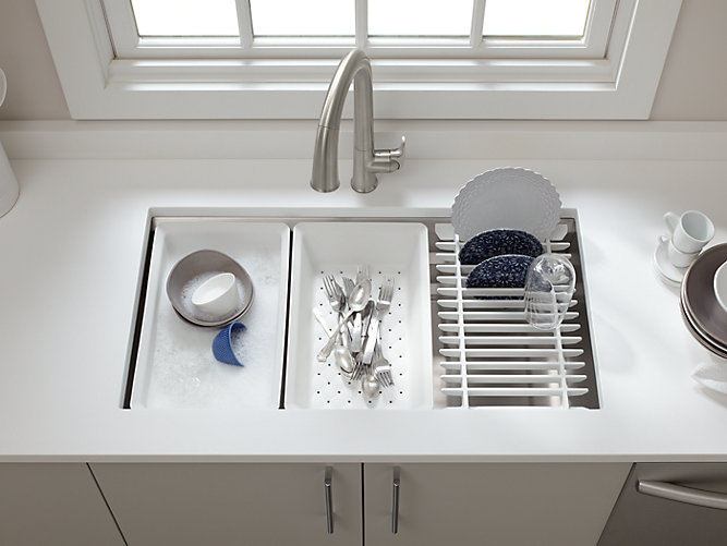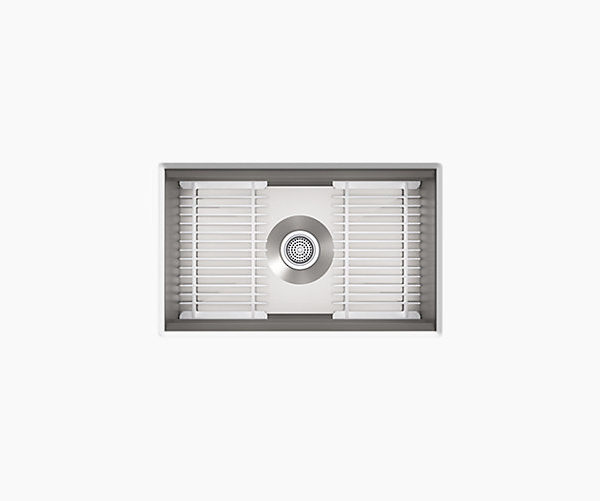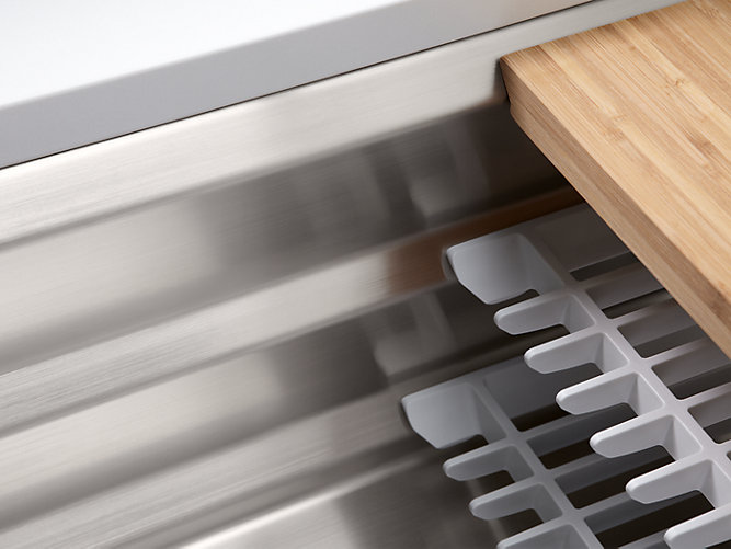 Create a highly functional kitchen workstation with the Prolific sink and its 5 included accessories. This innovative stainless-steel sink features three graduated ledges in the basin, so you can place accessories where you want them for maximum efficiency as you work. Other features include a unique cone-shaped drain for easier cleanup and SilentShield® sound absorption for less noise.
