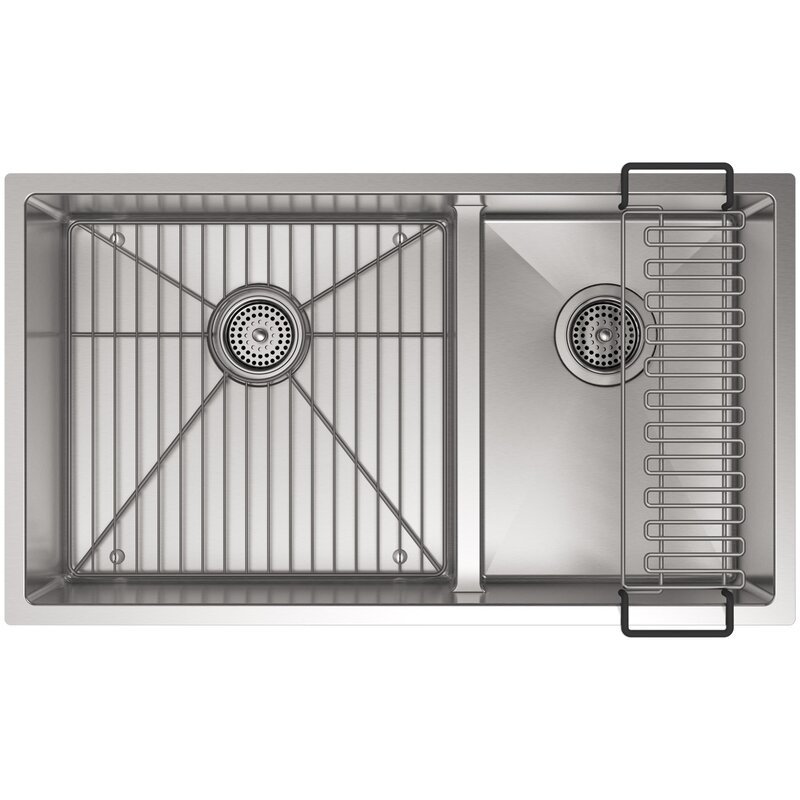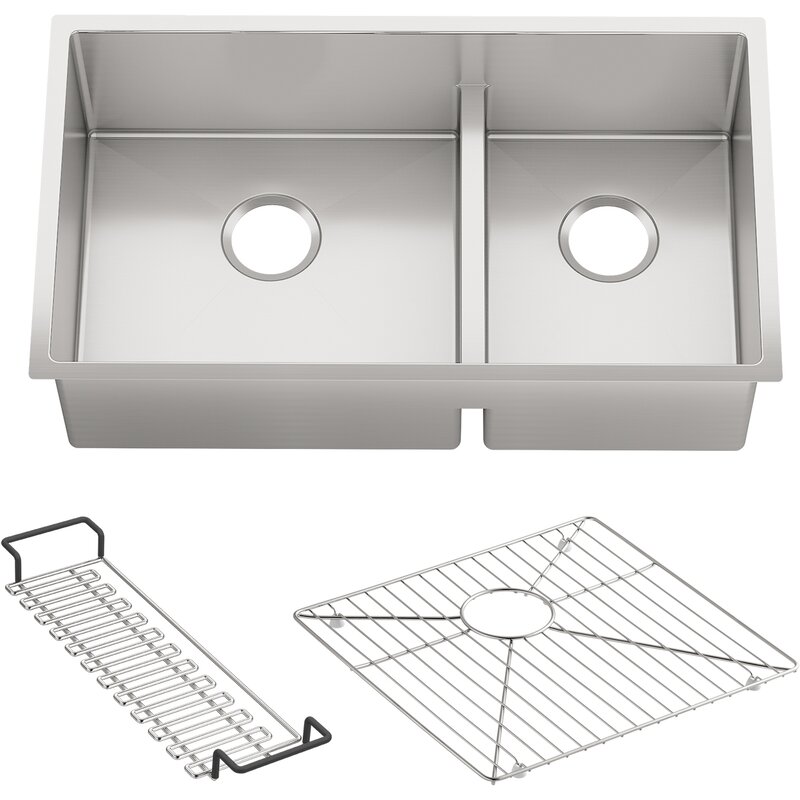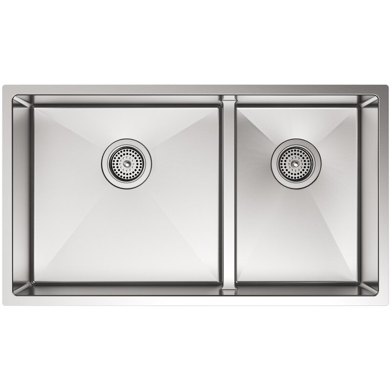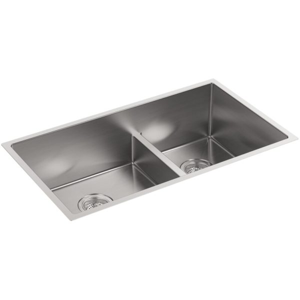 This Strive kitchen sink offers professional style with easy-to-clean curved corners. Made of thick, premium quality 16-gauge stainless steel, the double basin features a sound-absorption system that significantly reduces disposal and dishwashing noise. Two deep bowls allow you to soak and clean large cookware and bakeware.